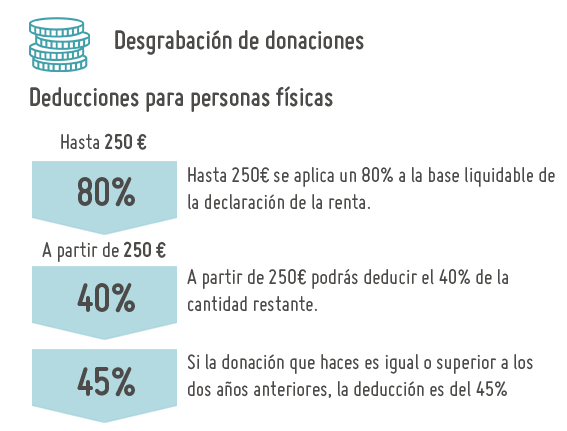 - Para los primeros 250€, podrás desgravarte del 80% del importe donado en tu declaración del IRPF, y el 40% para el resto.